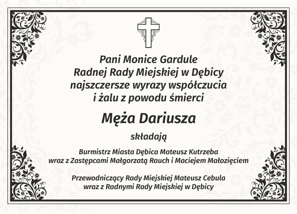 Z głębokim smutkiem przyjęliśmy wiadomość o śmierci męża Pani Moniki Garduły, Radnej Rady Miejskiej w Dębicy.